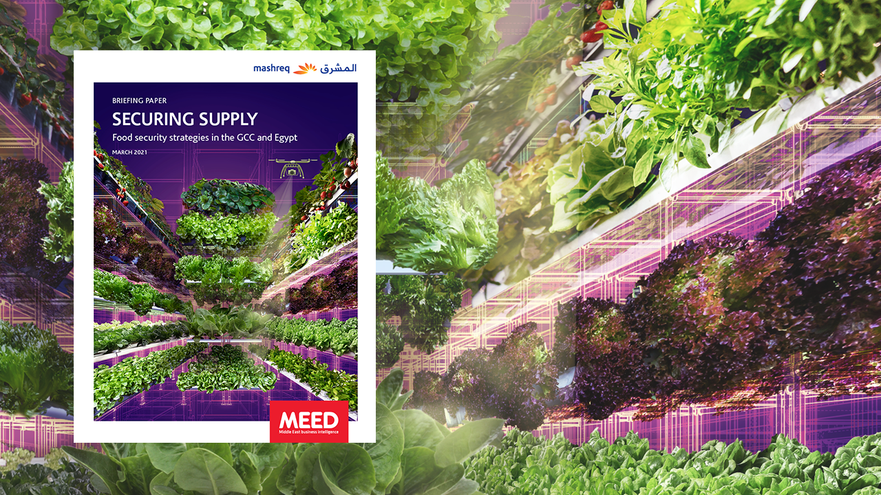 Securing Supply, the latest briefing paper produced by MEED in partnership with Dubai-based Mashreq Bank, discusses the food security strategies underway in the GCC and Egypt, including the shifting focus on self-sufficiency in sectors such as fisheries, dairy and poultry; enhancing in-country reserves; and growing investments in agricultural technology.
